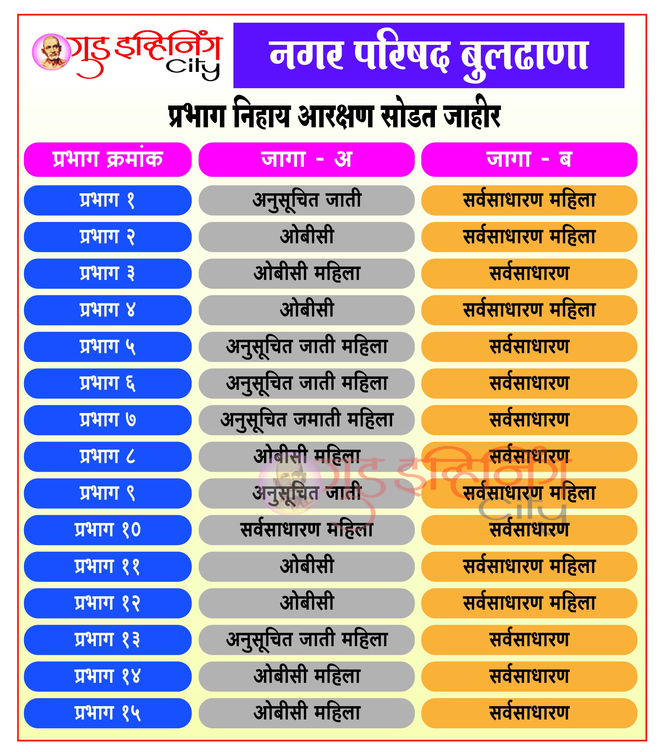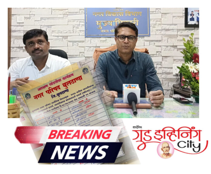 बुलढाणा, ८ ऑक्टोबर (गुड इव्हिनिंग सिटी) ः बुलढाणा नगर परिषद सार्वत्रिक निवडणूक-२०२५ करिता महिला आरक्षण सोडतीचा कार्यक्रम आज नगर परिषदेच्या सभागृहात पार पडला. एकुण १५ प्रभागात ३० नगरसेवकांपैकी अर्ध्या ठिकाणी महिलांकडे नेतृत्व असणार आहे. यासाठी अनुसूचित जाती, जमाती, ओबीसी तसेच सर्वसाधारण महिलांसाठी आज आरक्षण सोडतीचा कार्यक्रम झाला. नगर परिषदेच्या वरच्या सभागृहात उपविभागीय अधिकारी शरद पाटील यांच्या अधिपत्याखाली आरक्षण सोडत झाली. शाळकरी मुलींच्या हस्ते आरक्षण सोडत काढण्यात आली. सोडतीनुसार आता प्रभागनिहाय आरक्षण याप्रमाणे राहील.