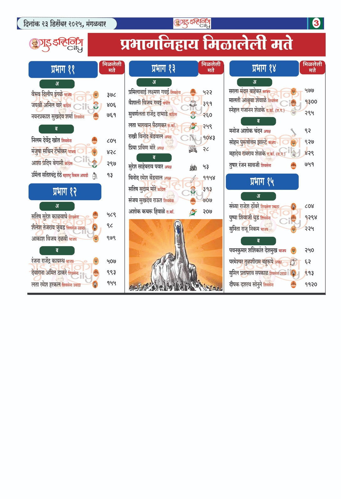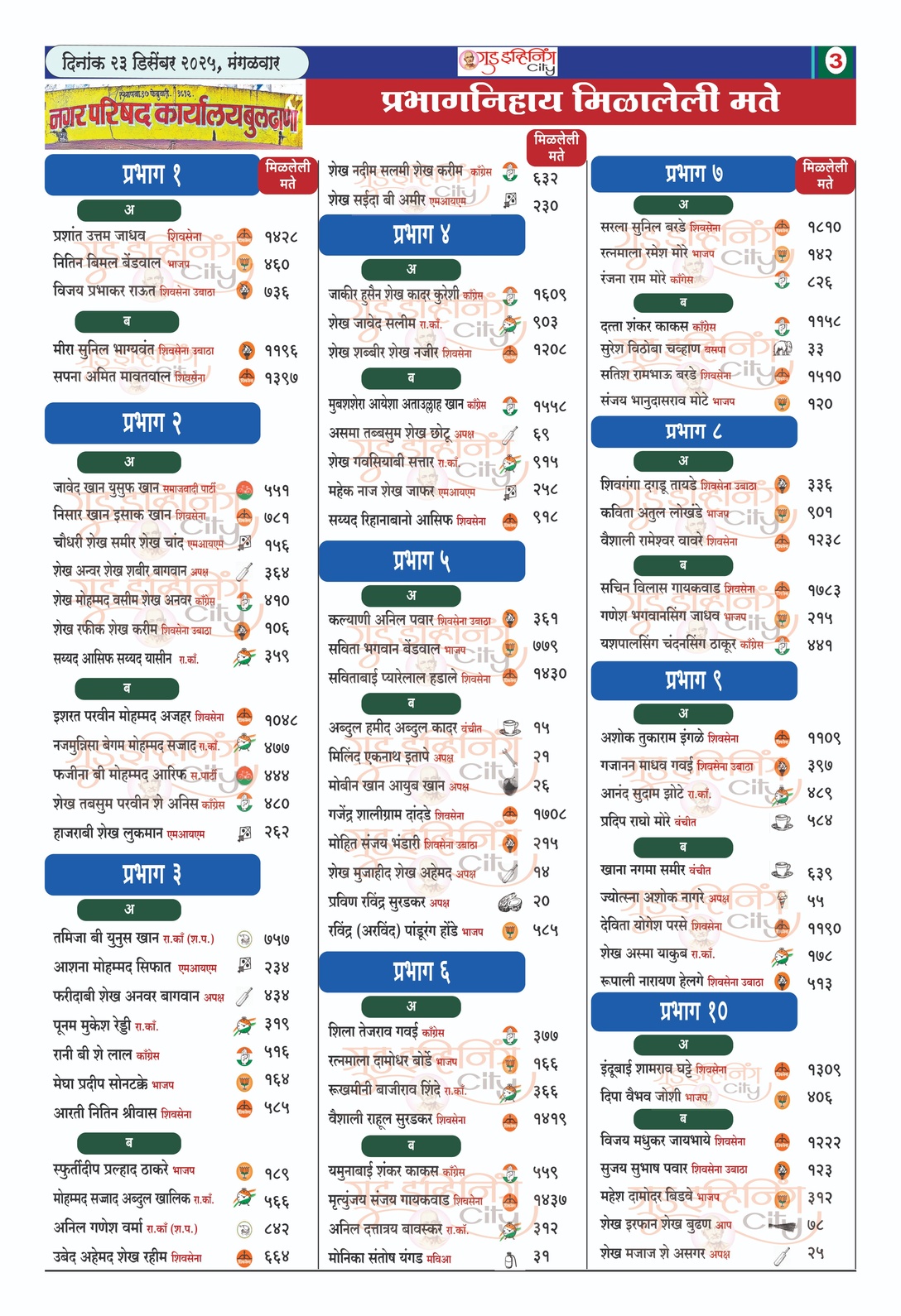 प्रभाग निहाय उमेदवारांना मिळालेली मते By Admin December 23, 2025 6273 WhatsAppFacebookCopy URLTelegramTwitter https://chat.whatsapp.com/Efmfst9caByBqCezG7bfyl Previous articleकोणत्या बुथवर कुणाला किती मते..?Next articleउद्या सव मध्ये इंदुरीकर महाराज यांचे किर्तन Related Articles ताज्या बातम्या शिरपूरमध्ये सुमारे 3200 पदांसाठी भव्य रोजगार मेळावा रविवारी ताज्या बातम्या मॉं जिजाऊंना मानवंदना; बुलढाणा जिल्हा पत्रकार संघातर्फे व्याख्यानाचे आयोजन ताज्या बातम्या सपकाळांचे भाग्य फळफळले… उदय देशपांडेंचा सन्मान आणि मोहन पऱ्हाड यांना निष्ठेचे फळ ताज्या बातम्या ताज्या बातम्या शिरपूरमध्ये सुमारे 3200 पदांसाठी भव्य रोजगार मेळावा रविवारी ताज्या बातम्या मॉं जिजाऊंना मानवंदना; बुलढाणा जिल्हा पत्रकार संघातर्फे व्याख्यानाचे आयोजन ताज्या बातम्या सपकाळांचे भाग्य फळफळले… उदय देशपांडेंचा सन्मान आणि मोहन पऱ्हाड यांना निष्ठेचे फळ ताज्या बातम्या अन्न व औषध सहाय्यक आयुक्त गजानन घिरके यांचा जिजाऊ सृष्टीवर विशेष सत्कार ताज्या बातम्या डॉ.गोडे मेडीकल कॉलेजला पदव्युत्तर पदवीची मान्यता Load more
