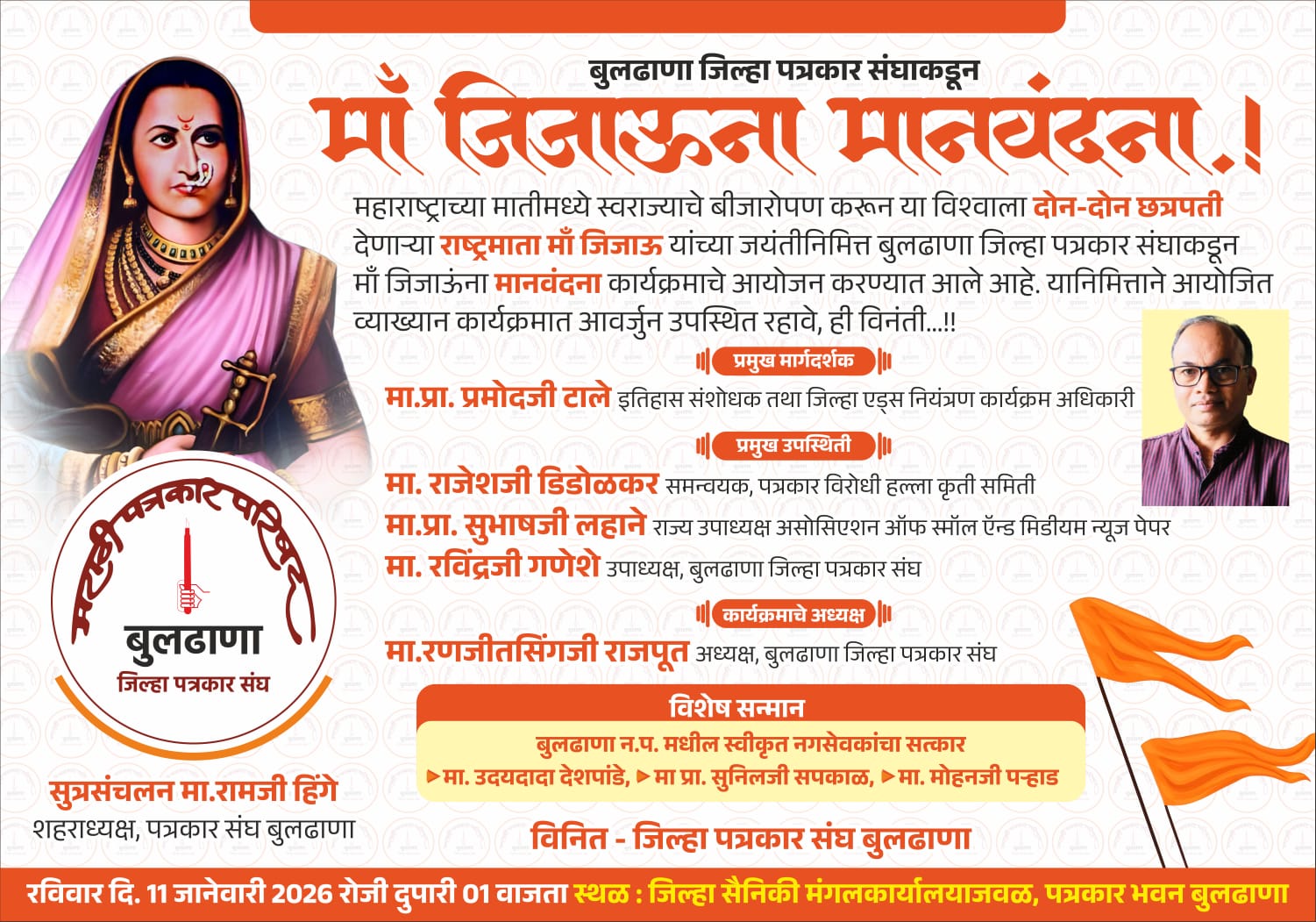 बुलढाणा, १० जानेवारी (गुड इव्हिनिंग सिटी) : महाराष्ट्राच्या मातीत स्वराज्याचे बीज रोवून संपूर्ण जगाला दोन-दोन छत्रपती देणार्‍या राष्ट्रमाता मॉं जिजाऊ यांच्या जयंतीनिमित्त बुलढाणा जिल्हा पत्रकार संघाच्या वतीने ‘मॉं जिजाऊंना मानवंदना’ या कार्यक्रमाचे आयोजन ११ जानेवारी रोजी दुपारी १ वाजता पत्रकार भवन बुलढाणा येथे करण्यात आले आहे. या निमित्ताने व्याख्यान कार्यक्रमही आयोजित करण्यात आला. या कार्यक्रमात प्रा. प्रमोद टाले इतिहास संशोधक तथा जिल्हा एड्स नियंत्रण कार्यक्रम अधिकारी हे प्रमुख मार्गदर्शक म्हणून मार्गदर्शन करणार आहेत. तर राजेश डिडोळकर समन्वयक, पत्रकार विरोधी हल्ला कृती समिती यांची प्रमुख उपस्थिती राहणार आहे. याशिवाय प्रा.सुभाष लहाने राज्य उपाध्यक्ष, असोसिएशन ऑफ स्मॉल ऍण्ड मिडीयम न्यूज पेपर आणि रविंद्र गणेशे उपाध्यक्ष, बुलढाणा जिल्हा पत्रकार संघ हे मान्यवर उपस्थित राहणार आहेत.कार्यक्रमाच्या अध्यक्षस्थानी रणजीतसिंग राजपूत अध्यक्ष, बुलढाणा जिल्हा पत्रकार संघ राहणार असून, सूत्रसंचलन राम हिंगे शहराध्यक्ष, बुलढाणा जिल्हा पत्रकार संघ करणार आहेत.