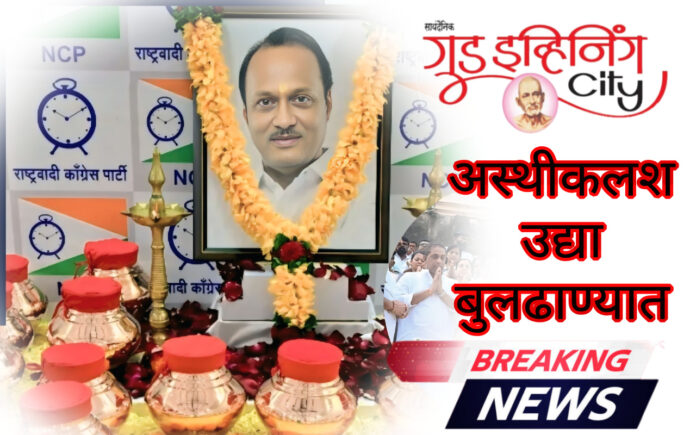 बुलढाणा, ४ फेब्रुवारी (गुड इव्हिनिंग सिटी) ः महाराष्ट्र राज्याचे उपमुख्यमंत्री स्व. अजीतदादा पवार यांच्या अस्थिकलशाची कालपासून जिल्हा परिक्रमा सूरू आहे. उद्या, गुरुवार ५ फेब्रुवारी रोजी हा अस्थिकलश बुलढाणा येथे आणला जात आहे. सकाळी ९ वाजता जयस्तंभ चौक, गांधी भवनमध्ये या पवित्र अस्थिकलशाचे दर्शन घेता येईल. काल, जिजाऊ जन्मस्थळावरून अस्थिकलशाची जिल्हा परिक्रमा सुरु झाली. लोणार, मेहकर, खामगांव, शेगांव याठिकाणी अस्थिकलश आला. आज इतर तालुक्यांमध्ये परिक्रमा आहे. उद्या, बुलढाणा जिल्हा मुख्यालयी अस्थिकलशाचे दर्शन घेता येईल. स्व. अजीतदादा यांच्या अंत्यसंस्कारात अनेकांना सहभागी होता आले नाही, परंतु त्यांचा अस्थिकलश थेट बुलढाण्यातच येत असल्यामुळे अंतिम दर्शनाची सोय उपलब्ध आहे. अजीतदादा प्रेमींनी अधिकाधिक संख्येने अस्थिकलशाच्या दर्शनासाठी यावे, असे आवाहन राष्ट्रवादीचे जिल्हाध्यक्ष नरेश शेळके यांनी केले आहे.
